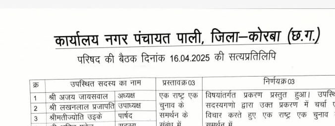 कोरबा देश में लोकतांत्रिक सुधार की दिशा में एक महत्वपूर्ण पहल के रूप में नगर पंचायत पाली ने 16 अप्रैल 2025 को आयोजित परिषद की बैठक में “एक राष्ट्र, एक चुनाव” के समर्थन में सर्वसम्मति से प्रस्ताव पारित किया। यह बैठक नगर पंचायत अध्यक्ष श्री अजय जायसवाल की अध्यक्षता में संपन्न हुई, जिसमें उपाध्यक्ष श्री तखलाल प्रजापति सहित कुल 16 पार्षदगण उपस्थित रहे।