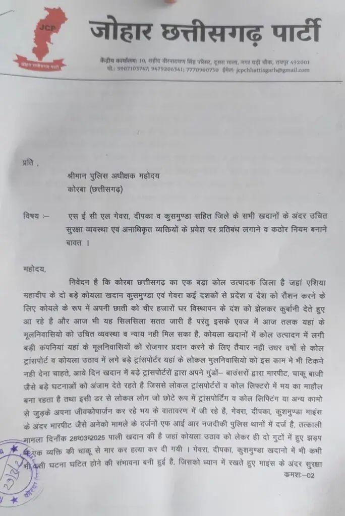 कोरबा :- कल देर रात हुई सरायपाली बुड़बुड़ खदान में हत्या कांड के बाद जोहार छत्तीसगढ़ राजनीतिक पार्टी ने कोरबा पुलिस अधीक्षक कोरबा एवं एसईसीएल प्रबंधन को पत्र लिखते हुए खदानों में अनाधिकृत व्यक्तियों के प्रवेश पर रोक लगाने की बात कही है पार्टी से चुनाव लड़ चुके भूविस्थापित सुरेंद्र प्रसाद राठौर ने बताया जो घटना सराय पाली बुडबुड खदान में हुई है ऐसे ही घटना उसके साथ भी हो चुकी है करीब 2 वर्ष पहले इसी गिरोह ने सुरेंद्र राठौर के साथ भी गाली गलौज मारपीट करने की धमकी दी थी जिसकी शिकायत भी पुलिस में की गई थी आयेदिन इस तरह के कोल माफिया छोटे-मोटे ठेकेदारों सहित लोकल ट्रांसपोर्टर पर हावी होता जा रहा है जिसे लेकर दहशत का माहौल बना रहता है एशिया की सबसे बड़ी गेवरा खदान में भी एक नामी गिरामी व्यक्ति द्वारा आए दिन गुंडागर्दी एवं कॉल ट्रांसपोर्टरों से हुज्जत बाजी की जाती है जो की पूर्व में एक कांग्रेस मंत्री से जुड़ा हुआ था जो अब वर्तमान में भाजपा के सदस्यता लेने के बाद भी उसका रंगबाज रवैया कम नहीं हुआ है आए दिन उसके द्वारा छोटे-मोटे ट्रांसपोर्टर और कोल कर्मियों को धमकाया जाता है जिस पर लगाम लगाने की जरूरत है जोहार छत्तीसगढ़ पार्टी द्वारा दिए गए