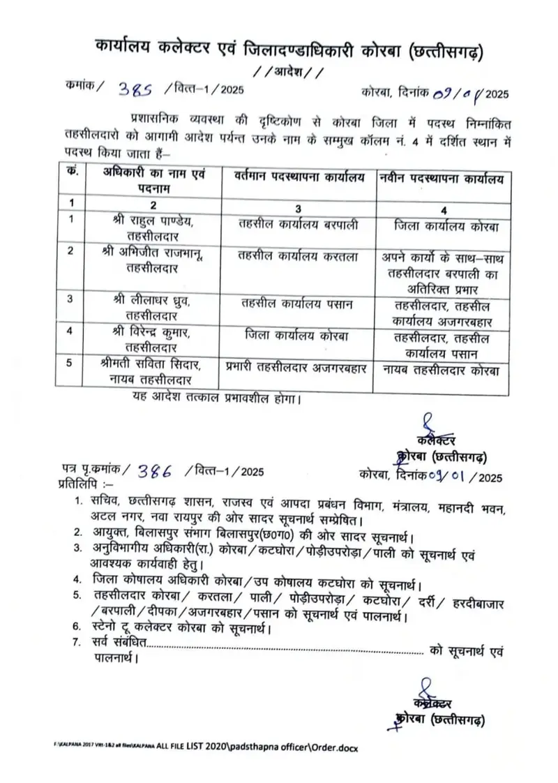 कोरबा । कोरबा जिले में प्रशासनिक कार्यो में कसावट लाने हेतु प्रशासनिक फेरबदल करते हुए कलेक्टर ने तहसीलदारों के तबादला आदेश जारी किया है। इस तबादला सूची में कई तहसीलदारों को नई जिम्मेदारियां सौंपी गई हैं। प्रशासनिक व्यवस्था को सुचारू बनाने और कामकाज में सुधार लाने के उद्देश्य से यह कदम उठाया गया है।