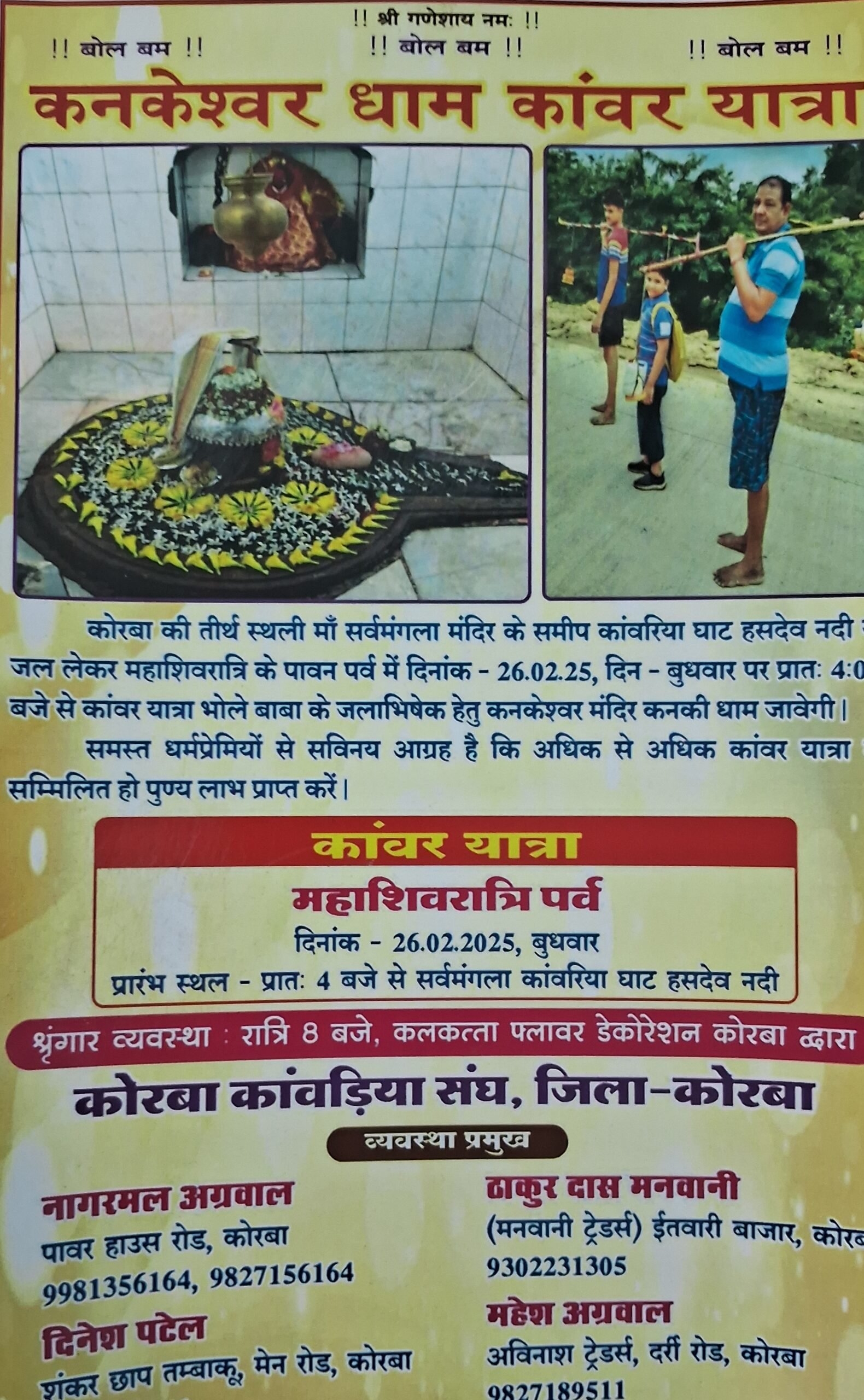 कोरबा की तीर्थस्थली मां सर्वमंगला मंदिर के समीप कांवरिया घाट हसदेव नदी से जल लेकर महाशिवरात्रि के पावन पर्व में दिनांक 26 दिन बुधवार पर प्रात 4:00 बजे से कावड़ यात्रा भोले बाबा के जलाभिषेक हेतु कनकेश्वर मंदिर कनकी धाम में जावेगी समस्त धर्म प्रेमियों एवं से सविनय आग्रह है कि अधिक से अधिक संख्या में कावड़ यात्रा हेतु सम्मिलित होकर पुण्य लाभ प्राप्त करें रात्रि के 8:00 बजे विशेष सिंगर की व्यवस्था कोलकाता फ्लावर डेकोरेशन के द्वारा भी की गई है । कार्यक्रम की व्यवस्था प्रमुख नागरमल अग्रवाल, ठाकुरदास मनवाणी, दिनेश पटेल एवं महेश अग्रवाल जी है। जय महाकाल