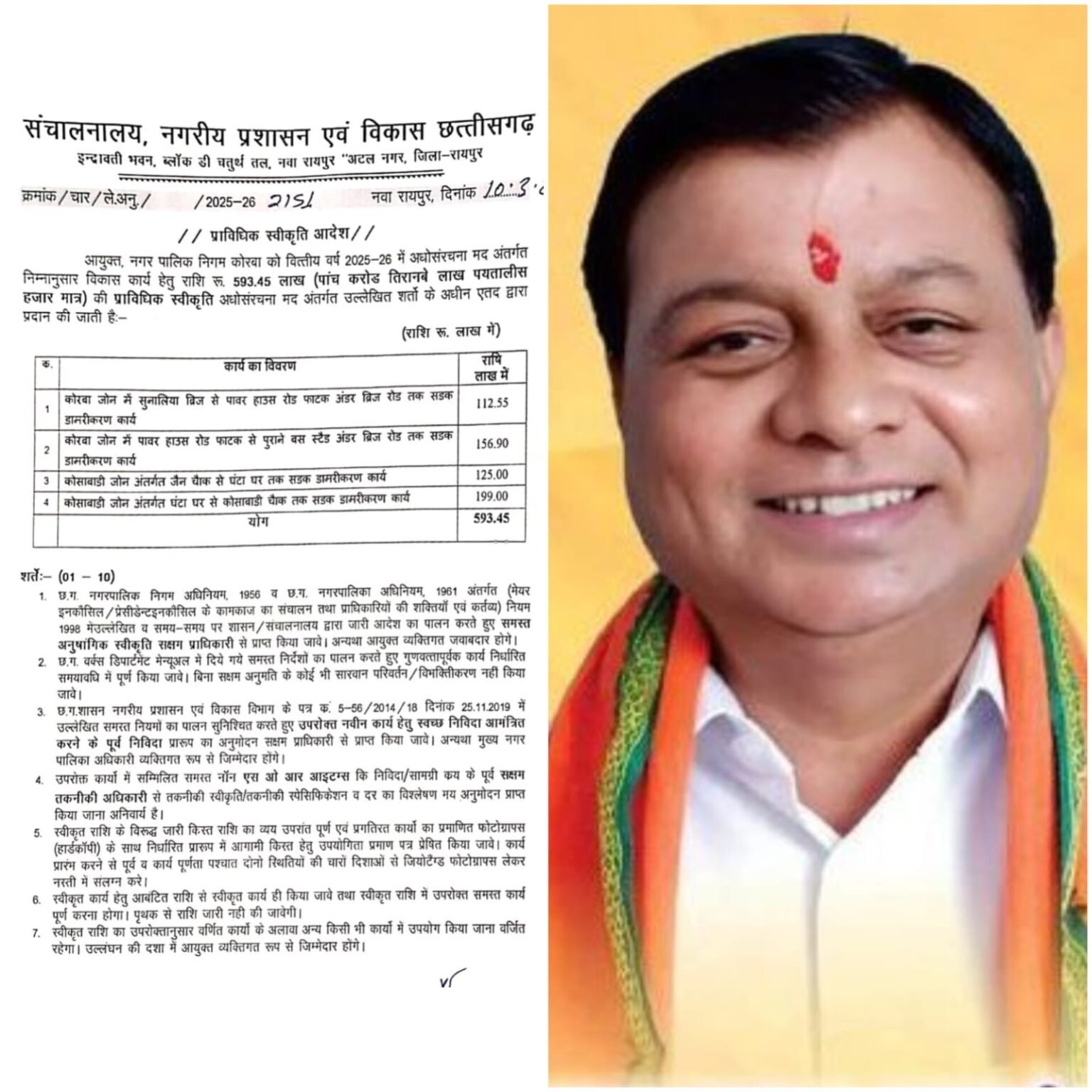कोरबा। नगर विधायक और कैबिनेट मंत्री लखन लाल देवांगन के प्रयासों से कोरबा शहर के चार प्रमुख मार्गो के डामरीकरण हेतु 5.93 करोड़ की स्वीकृति नगरीय प्रशासन एवं विकास विभाग द्वारा अधोसंरचना मद से दी गई है।