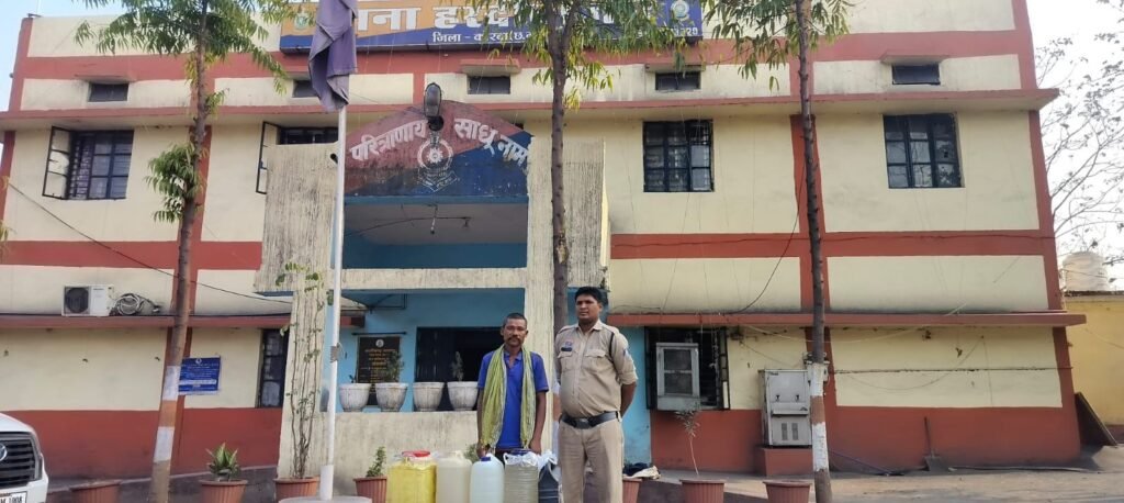 राजकुमार अगरिया पिता ईतवार अगरिया उम्र 40 वर्ष निवासी ग्राम अण्डीकछार धनवारपारा थाना हरदीबाजार, जिला कोरबा पुलिस अधीक्षक कोरबा श्री सिद्धार्थ तिवारी (भा.पु.से.), अतिरिक्त पुलिस अधीक्षक कोरबा श्री नितिष ठाकुर (रा.पु.से.), नगर पुलिस अधीक्षक दर्री श्री विमल कुमार पाठक (भा.पु.से.) द्वारा अवैध शराब पर प्रभावी कार्यवाही करने निर्देशित किया गया है। वरिष्ठ अधिकारियों के मार्गदर्शन में थाना प्रभारी हरदीबाजार के नेतृत्व में हरदीबाजार क्षेत्र में अवैध शराब बिक्री करने वालों पर कार्यवाही की जा रही है। दिनांक 05.04.2025 को मुखबीर से सूचना मिला कि ग्राम अण्डीकछार धनवारपारा निवासी राजकुमार अगरिया द्वारा अपने घर के परछी में अवैध रूप से भारी मात्रा में कच्ची महुआ शराब छुपाकर रखकर विक्रय कर रहा है सूचना पर हमराह स्टॉफ एवं गवाहों को साथ लेकर मौके पर जाकर रेड कार्यवाही करने पर आरोपी राजकुमार अगरिया पिता ईतवार अगरिया उम्र 40 वर्ष निवासी ग्राम अण्डीकछार धनवारपारा थाना हरदीबाजार, जिला कोरबा (छ.ग.) के कब्जा से चार अलग अलग प्लास्टिक जरीकने में भरा कुल 45 लीटर हाथ भट्टी से बना कच्ची महुआ शराब, शराब बिक्री रकम व शराब बिक्री करने में उपयोग किये जाने वाले पन्नी को बरामद कर जप्त किया गया। आरोपी का कृत्य धारा सदर का अपराध घटित करना पाये जाने से अपराध क्रमांक 44/2025 धारा 34(2) आबकारी अधिनियम कायम कर आरोपी को गिरफ्तार कर न्यायिक रिमाण्ड पर भेजा गया है।