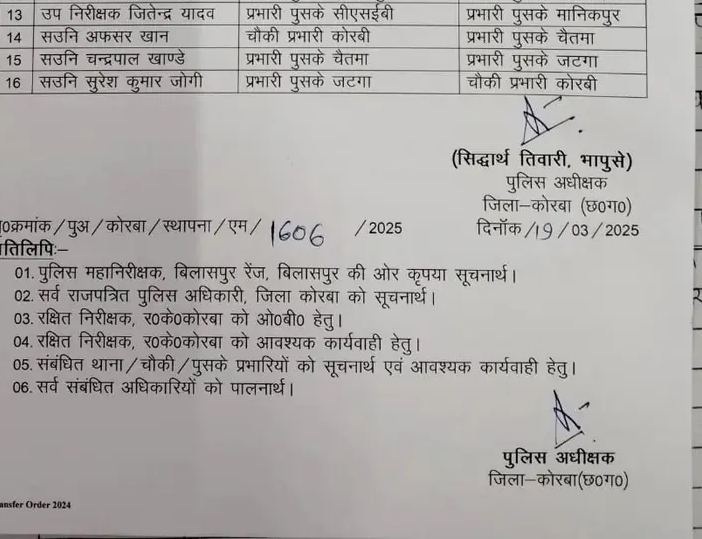 कोरबा: कोरबा जिले में पुलिस प्रशासन में बड़े स्तर पर फेरबदल किया गया है। जिला पुलिस विभाग ने लगभग सभी थानों के प्रभारियों को बदलने का फैसला लिया है। यह तबादला आदेश कानून व्यवस्था को और अधिक सुदृढ़ करने और पुलिसिंग को प्रभावी बनाने के उद्देश्य से किया गया है।