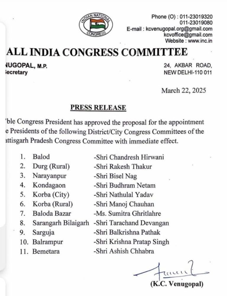 रायपुर। छत्तीसगढ़ के 11 जिलों में कांग्रेस ने जिला अध्यक्षों की नियुक्ति की है. AICC ने इस संबंध में आदेश जारी किया है.AICC से जारी आदेश के मुताबिक, बालोद में चंद्रेश हिरवानी, दुर्ग (ग्रामीण) राकेश ठाकुर, नारायणपुर में बिसेल नाग, कोंडागांव में बुधराम नेताम, कोरबा (शहर) नाथूलाल यादव, कोरबा (ग्रामीण) मनोज चौहान, बलौदाबाजार में सुमित्रा घृतलहरे, सारंगढ़-बिलागढ़ में ताराचंद देवांगन, सरगुजा में बालकृष्ण पाठक, बलरामपुर में कृष्ण प्रताप सिंह और बेमेतरा में आशीष छाबड़ा अध्यक्ष बनाए गए हैं. देखें आदेश –