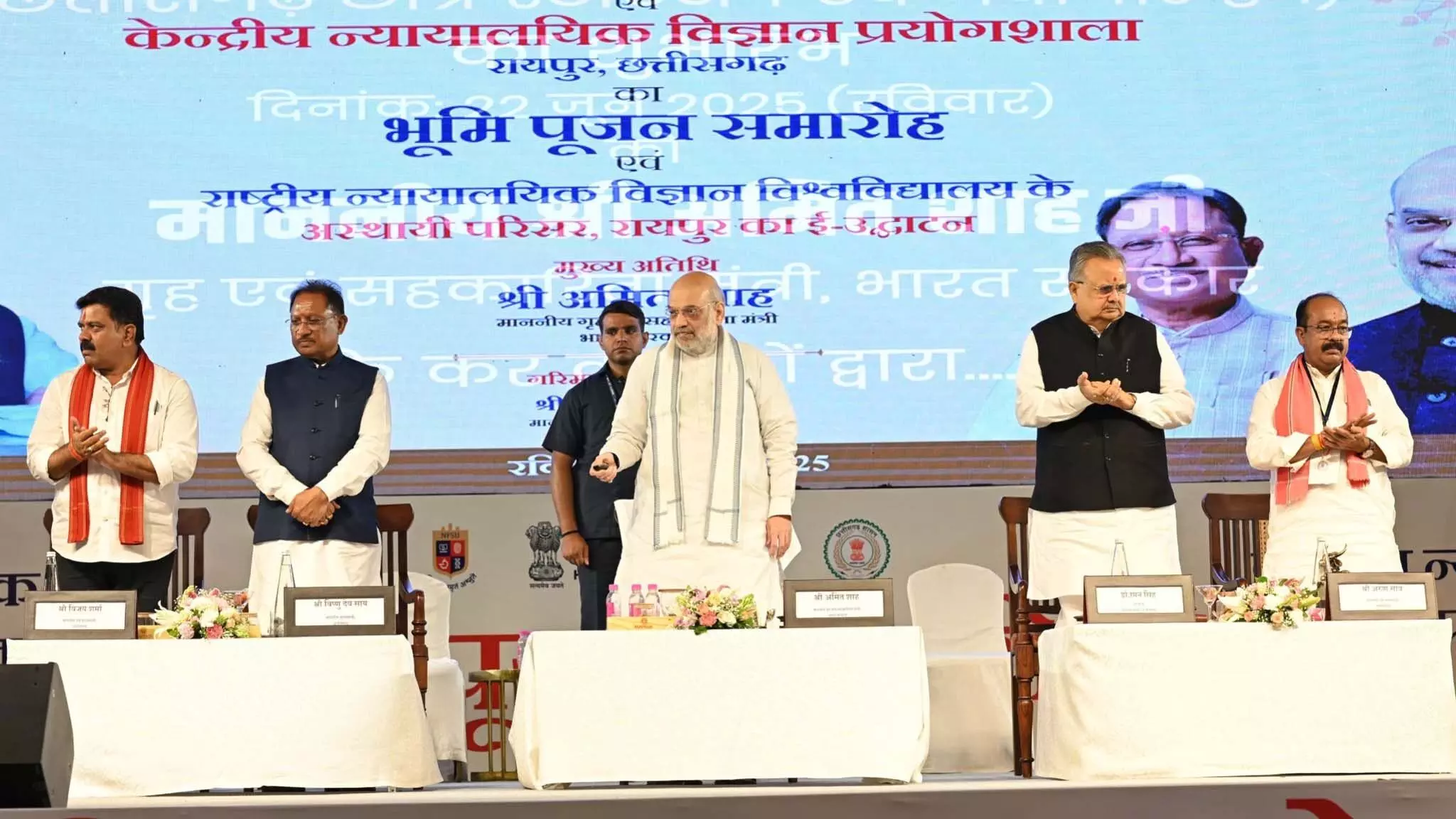 रायपुर। छत्तीसगढ़ की राजधानी नवा रायपुर (अटल नगर) में आज एक ऐतिहासिक अवसर पर केंद्रीय गृह मंत्री अमित शाह ने राष्ट्रीय फोरेंसिक विज्ञान विश्वविद्यालय (NFSU) के अस्थायी परिसर का ई-उद्घाटन किया। इस कार्यक्रम में मुख्यमंत्री विष्णुदेव साय, विधानसभा अध्यक्ष डॉ. रमन सिंह, उपमुख्यमंत्री अरुण साव, विजय शर्मा सहित अनेक कैबिनेट मंत्री, सांसद, विधायक एवं प्रशासनिक अधिकारी उपस्थित रहे।