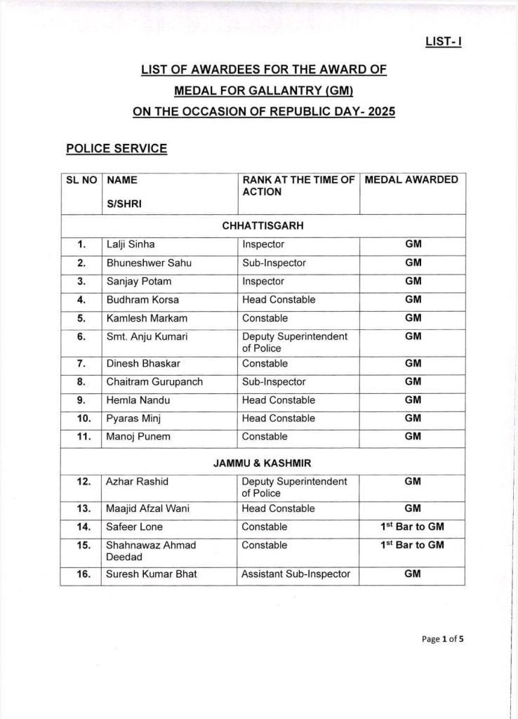 रायपुर. गणतंत्र दिवस पर 26 जनवरी 2025 को छत्तीसगढ़ पुलिस के 22 अधिकारियों को पदक से सम्मानित किया जाएगा. इसकी घोषणा भारत सरकार ने की है. गृह मंत्रालय के आदेश के मुताबिक, छत्तीसगढ़ से इंस्पेक्टर महेश राम साहू को राष्ट्रपति पदक से सम्मानित किया जाएगा. इसके अलावा 11 अधिकारियों को वीरता पदक और 10 अधिकारियों को विशिष्ट सेवाओं के लिए मेडल दिए जाएंगे.