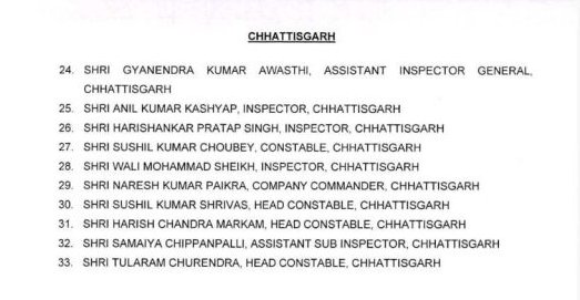 रायपुर. गणतंत्र दिवस पर 26 जनवरी 2025 को छत्तीसगढ़ पुलिस के 22 अधिकारियों को पदक से सम्मानित किया जाएगा. इसकी घोषणा भारत सरकार ने की है. गृह मंत्रालय के आदेश के मुताबिक, छत्तीसगढ़ से इंस्पेक्टर महेश राम साहू को राष्ट्रपति पदक से सम्मानित किया जाएगा. इसके अलावा 11 अधिकारियों को वीरता पदक और 10 अधिकारियों को विशिष्ट सेवाओं के लिए मेडल दिए जाएंगे.