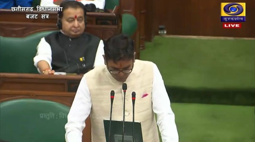 रायपुर। विधानसभा में बजट सत्र का आज पांचवां दिन है। वित्त मंत्री ओपी चौधरी विधानसभा में राज्य का 25वां और साय सरकार का दूसरा बजट पेश कर रहे हैं। बजट पेश करने से पहले वित्त मंत्री ओपी चौधरी लाल मखमली बैग लेकर अपने बंगले से वीआईपी रोड स्थित राम मंदिर पहुंचे और पूजा-अर्चना की। इस दौरान उन्होंने भगवान राम को दंडवत् होकर प्रणाम किया। इसके बाद मंत्री चौधरी छत्तीसगढ़ विधानसभा के लिए रवाना हुए।