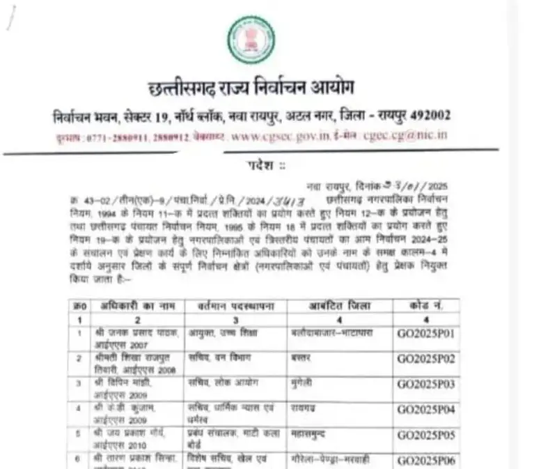 रायपुर। छत्तीसगढ़ में होने वाले नगरीय निकाय और त्रिस्तरीय पंचायत चुनाव के संचालन के लिए राज्य निर्वाचन आयोग ने अलग-अलग जिलों के लिए प्रेक्षकों की नियुक्ति की है।
