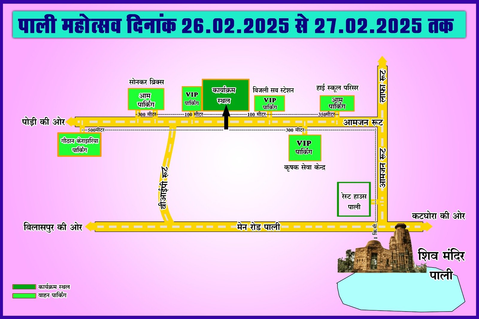 जिला प्रशासन कोरबा के सौजन्य से दिनांक 26.02.2025 से 27.02.2025 तक 02 दिवसीय पाली महोत्सव का आयोजन पाली महोत्सव मैदान, ग्राम पंचायत-केराझरिया (पाली) में किया जा रहा है। जिसका दिनांक 26.02.2025 को शुभारंभ के अवसर पर विभिन्न सांस्कृतिक संध्या सम्मेलन तथा दिनांक 27.02.2025 को कार्यक्रम का समापन किया जावेगा। इस अवसर पर शांति, सुरक्षा एवं यातायात व्यवस्था हेतु कोरबा पुलिस के द्वारा रूट चार्ट बनाया गया है:-