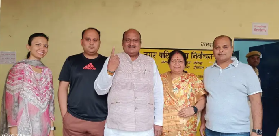 कोरबा: पूर्व मंत्री जयसिंह अग्रवाल ने मंगलवार की सुबह अपने वार्ड क्र. 5 देवांगन पारा के थाना स्कूल में परिवार के साथ महापौर एवं पार्षद के लिए मतदान किया।