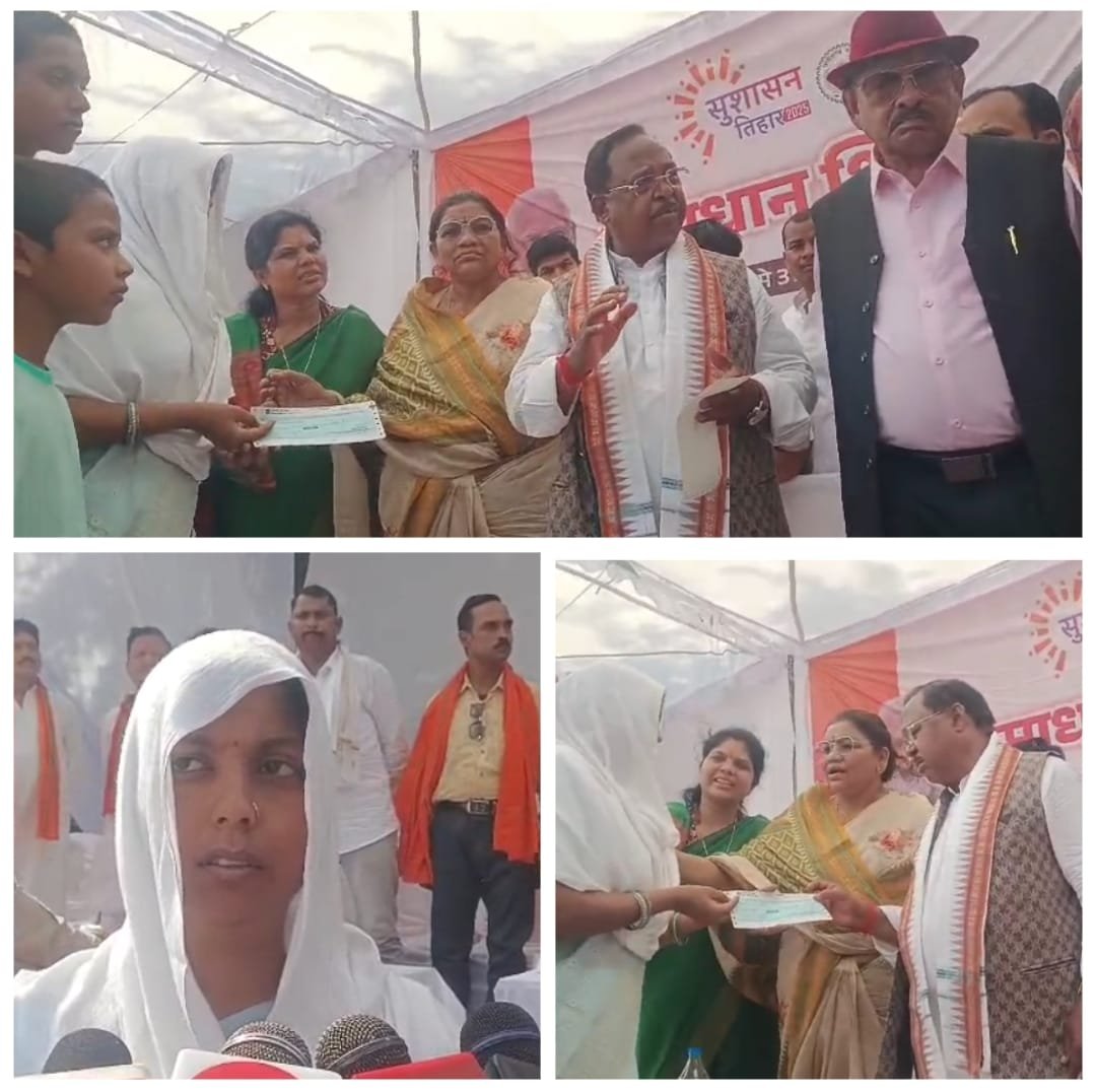 सुशासन तिहार में कठौतिया पहुचे जिले के प्रभारी मंत्री रामविचार नेताम ने दिया मृतक भाजपा कार्यकर्ता बाबू राम की पत्नी श्रीमती अन्नू को 5 लाख का चेक दिया।
