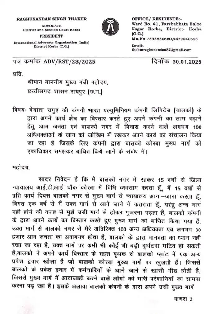 बालको ने मुख्य मार्ग को एकाधिकार समझकर किया बाधित, स्थानीय निवासियों सहित 100 वकीलों की जान खतरे में, अधिवक्ता रघुनंदन सिंह ठाकुर ने की सीएम से शिकायत
