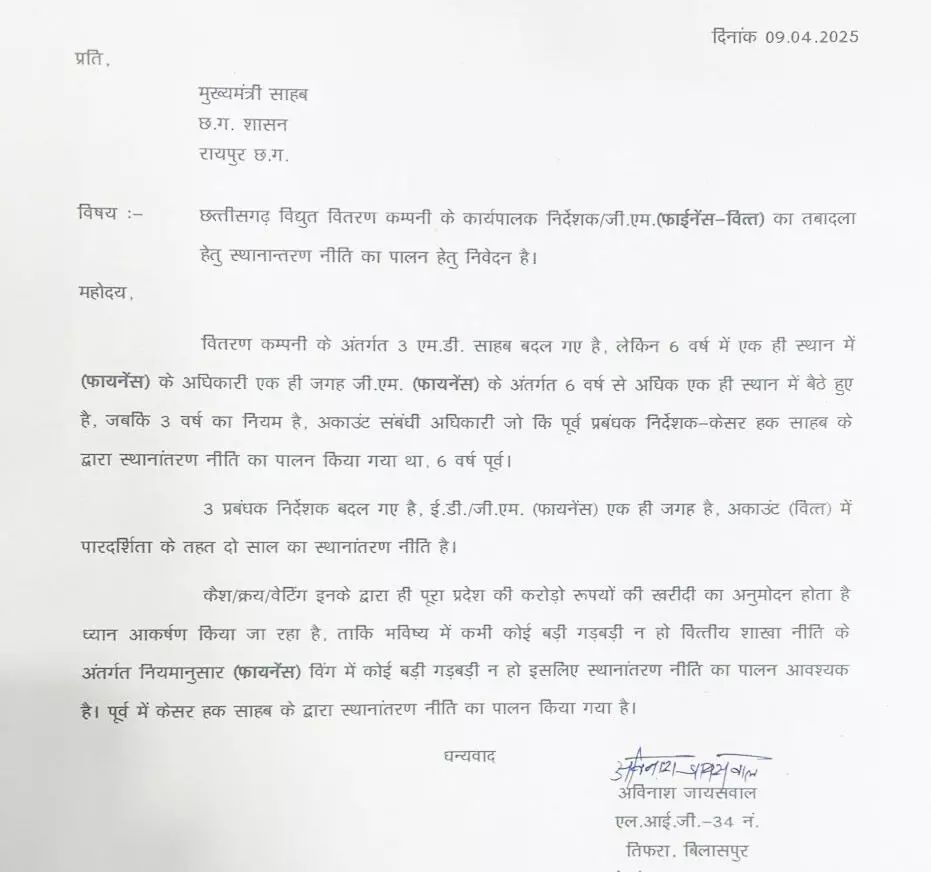 रायपुर। छत्तीसगढ़ बिजली वितरण कंपनी में वर्षों से एक ही स्थान पर जमे अधिकारियों को हटाने की मांग को लेकर यूनियन के पदाधिकारी लामबंद होने लगे हैं. मुख्यमंत्री विष्णुदेव साय को पत्र लिखकर कहा गया है कि बिजली कंपनी में स्थानांतरण नीति का पालन नहीं किया जा रहा है. छोटे अधिकारियों का दो से तीन साल के भीतर तबादला कर दिया जाता है, लेकिन बड़े अधिकारी सालों तक एक ही स्थान पर जमे हुए हैं. बिजली कंपनी से सेवानिवृत्त सेक्शन अधिकारी अविनाश जायसवाल ने मुख्यमंत्री के नाम लिखे पत्र में बताया है कि बिजली वितरण कंपनी के अंतर्गत अब तक तीन एमडी बदल चुके हैं, लेकिन पिछले छह वर्षों से एक ही स्थान पर ईडी और जीएम (फाइनेंस विंग) पद पर अधिकारी जमे हुए हैं. वहीं, फाइनेंस विंग के छोटे अधिकारियों और कर्मचारियों का तबादला किया जा रहा है. कंपनी में तीन वर्षों के भीतर सभी का तबादला करने के नियमों को अधिकारी ठेंगा दिखा रहे हैं.