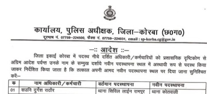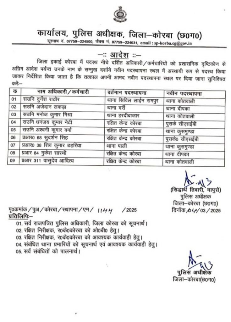 कोरबा जिला पुलिस अधीक्षक सिद्धार्थ तिवारी ने कोरबा जिलान्तर्गत शासकीय कार्यो में कसावट लाने हेतु एक तबादला सूची जारी की हैं। इस तबादला सूची के अनुसार 5 सब इंस्पेक्टर और 4 प्रधान आरक्षक का स्थानांतरण किया गया है।