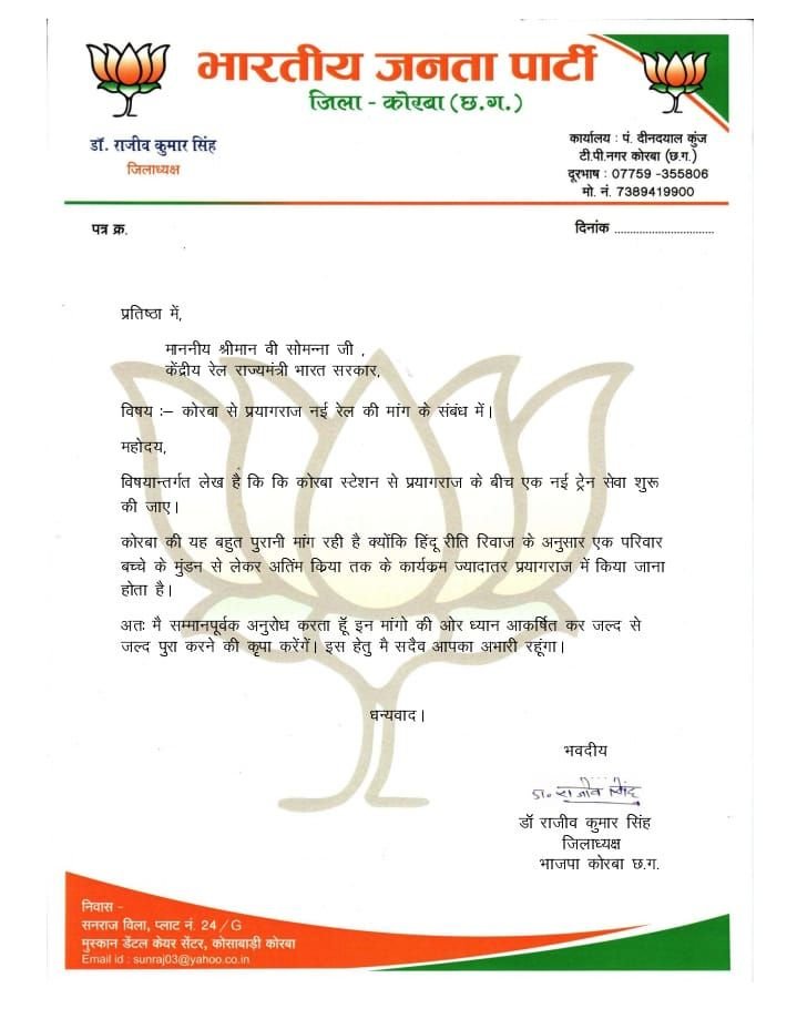 केंद्रीय रेल राज्य मंत्री से अपनी मुलाकात के दौरान भारतीय जनता पार्टी के जिला अध्यक्ष डॉ राजीव सिंह ने कोरबा से कोलकाता एवं प्रयागराज हेतु सीधी रेल सुविधा की मांग हेतु एक ज्ञापन सौंपा, साथ ही साथ कोरबा से बंद पड़ी कई ट्रेनों के संबंध में भी उनका ध्यान अवगत कराते हुए उन्होंने अन्य एक ज्ञापन भी सौंपा ।