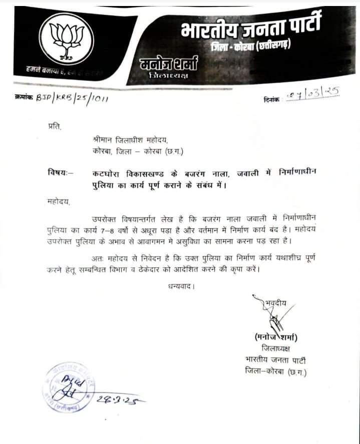 मनोज शर्मा ने अपने पत्र में उल्लेख किया कि कटघोरा विकासखंड के बजरंग नाला, जवाली में पुलिया निर्माण कार्य पिछले 7-8 वर्षों से अधूरा पड़ा है और वर्तमान में निर्माण कार्य पूरी तरह बंद हो गया है। पुलिया के अभाव में स्थानीय लोगों को भारी असुविधा का सामना करना पड़ रहा है। उन्होंने जिला प्रशासन से आग्रह किया कि संबंधित विभाग एवं ठेकेदार को आवश्यक निर्देश देकर पुलिया निर्माण कार्य को शीघ्र पूरा कराया जाए।