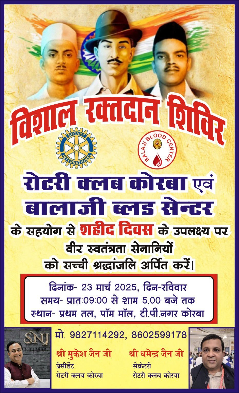 कोरबा, हमारे शहीदों के बलिदान का सम्मान करने और रक्तदान के महत्व को बढ़ावा देने के प्रयास में, रोटरी क्लब कोरबा बालाजी ब्लड सेंटर के सहयोग से शहीद दिवस के अवसर पर विशाल रक्तदान शिविर का आयोजन कर रहा है।