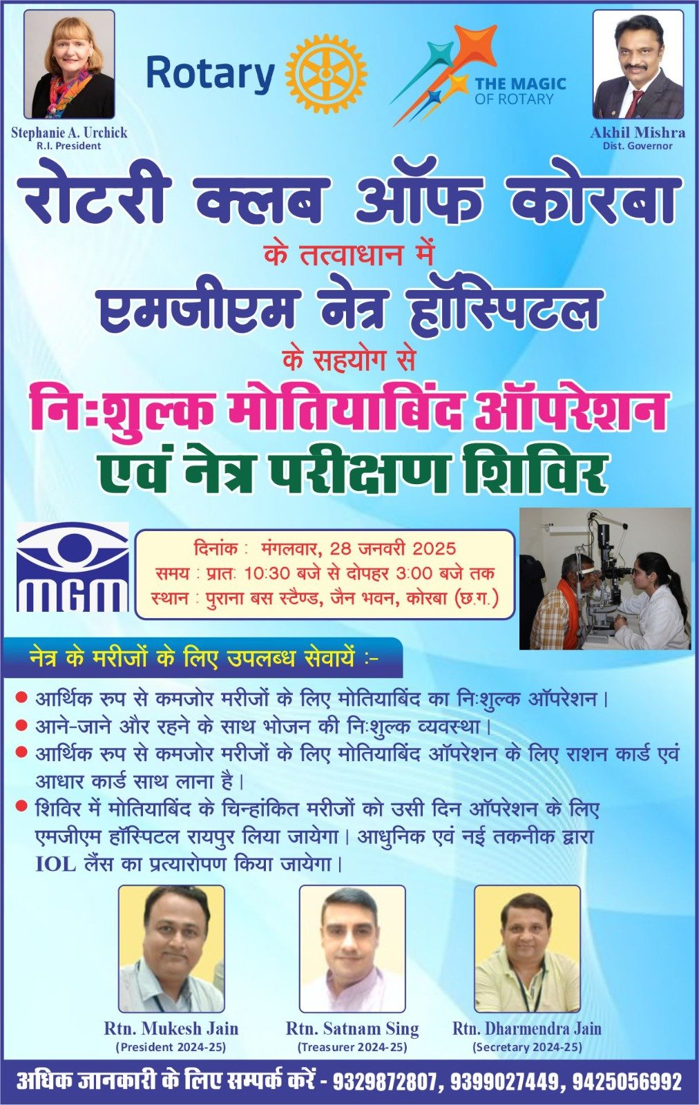 रोटरी क्लब ऑफ कोरबा और रोटरी क्लब ग्रेटर रायपुर द्वारा एम जी एम हॉस्पिटल रायपुर के सहयोग से 28 जनवरी को पुराना बस स्टैंड कोरबा में निशुल्क मोतियाबिंद नेत्र परीक्षण कैंप का आयोजन किया जा रहा है।