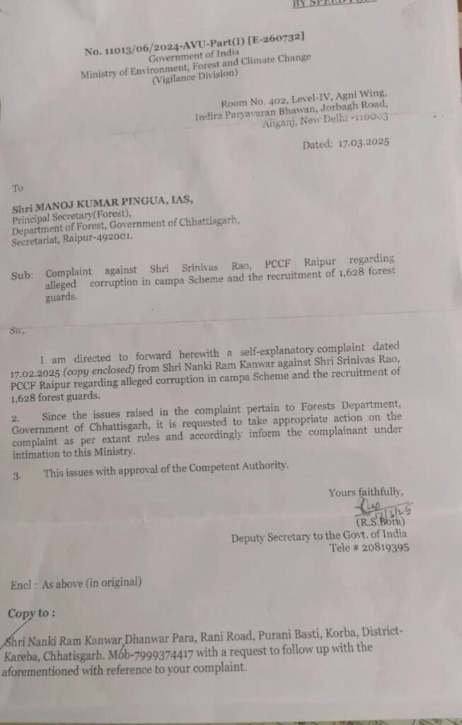 रायपुर। छत्तीसगढ़ के वन विभाग में बड़ा घोटाला उजागर हुआ है। प्रदेश के प्रधान मुख्य वन संरक्षक (PCCF) श्रीनिवास राव के खिलाफ 1,628 वनरक्षकों की भर्ती में भ्रष्टाचार और कैम्पा (CAMPA) योजना में अनियमितताओं को लेकर गंभीर आरोप लगे हैं। इस मामले में केंद्र सरकार की पर्यावरण, वन एवं जलवायु परिवर्तन मंत्रालय (सतर्कता शाखा) ने राज्य के प्रमुख सचिव (वन) मनोज कुमार पिंगुआ को जांच कर कार्रवाई करने के निर्देश दिए हैं।