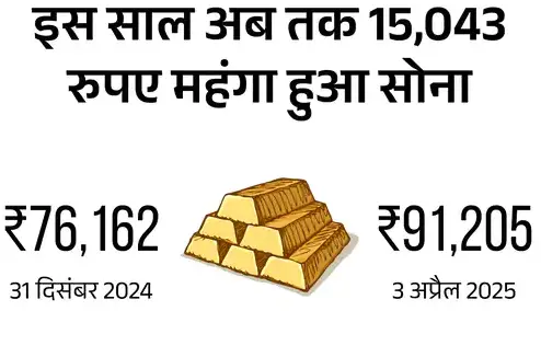 नई दिल्ली । सोने ने आज यानी 3 अप्रैल को ऑल टाइम हाई बनाया है। इंडिया बुलियन एंड ज्वेलर्स एसोसिएशन (IBJA) के अनुसार, 10 ग्राम 24 कैरेट सोने का दाम 209 रुपए बढ़कर 91,205 रुपए के ऑल टाइम हाई पर पहुंच गया है। इससे पहले सोना 90,996 रुपए पर था। वहीं 1 अप्रैल को सोने ने 91,115 रुपए का ऑल टाइम हाई बनाया था।