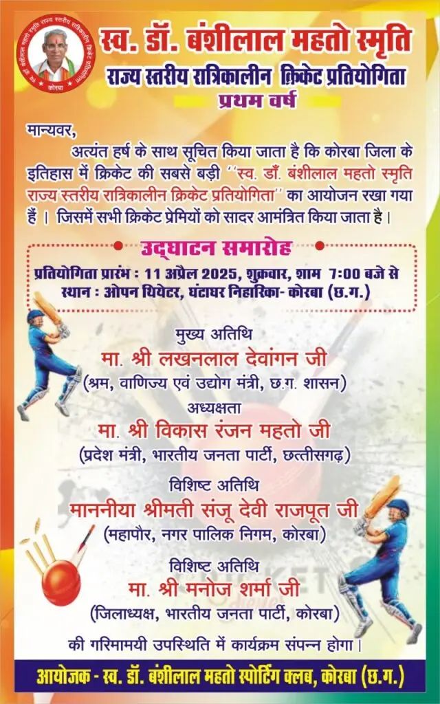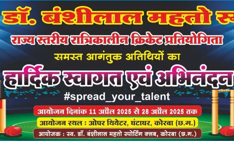 कोरबा। छत्तीसगढ़ का कोरबा जिला आज एक ऐतिहासिक और भावनात्मक खेल आयोजन का साक्षी बनने जा रहा है। स्वर्गीय डॉ. बंशी लाल महतो स्मृति राज्य स्तरीय रात्रिकालीन क्रिकेट प्रतियोगिता का शुभारंभ कल शुक्रवार से होगा, जिसमें प्रदेश भर की 32 टीमें भाग लेंगी। इस आयोजन की विशेष बात यह है कि इसकी शुरुआत दिव्यांग व्हीलचेयर क्रिकेट मैच से होगी — जो न केवल खेल भावना का उत्सव है, बल्कि आत्मबल, समर्पण और सामाजिक समावेशिता का गूंजता हुआ संदेश भी है।