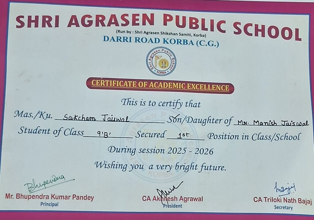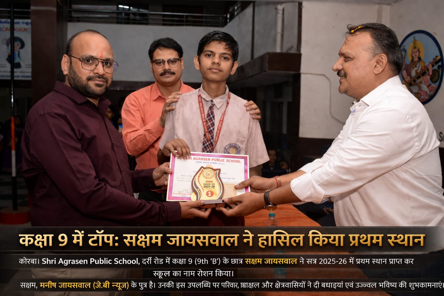 рдХреЛрд░рдмрд╛ред рдХрдХреНрд╖рд╛ 9 рдХреЗ рдореЗрдзрд╛рд╡реА рдЫрд╛рддреНрд░ рд╕рдХреНрд╖рдо рдЬрд╛рдпрд╕рд╡рд╛рд▓ рдХреЛ рдЙрдирдХреЗ рд╢рд╛рдирджрд╛рд░ рдкреНрд░рджрд░реНрд╢рди рдХреЗ рд▓рд┐рдП рд╡рд┐рджреНрдпрд╛рд▓рдп рдореЗрдВ рдЖрдпреЛрдЬрд┐рдд рд╕рдорд╛рд░реЛрд╣ рдореЗрдВ рд╕рдореНрдорд╛рдирд┐рдд рдХрд┐рдпрд╛ рдЧрдпрд╛ред 94.33% рдЕрдВрдХ рд▓рд╛рдХрд░ рдХрдХреНрд╖рд╛ рдореЗрдВ рдЯреЙрдк рдХрд░рдиреЗ рд╡рд╛рд▓реЗ рд╕рдХреНрд╖рдо рдХреЛ рдордВрдЪ рдкрд░ рдкреНрд░рд╢рд╕реНрддрд┐ рдкрддреНрд░ рджреЗрдХрд░ рд╕рдореНрдорд╛рдирд┐рдд рдХрд┐рдпрд╛ рдЧрдпрд╛, рдЬрд┐рд╕рдХрд╛ рдпрд╣ рдЦрд╛рд╕ рдкрд▓ рддрд╕реНрд╡реАрд░ рдореЗрдВ рдХреИрдж рд╣реБрдЖ рд╣реИред