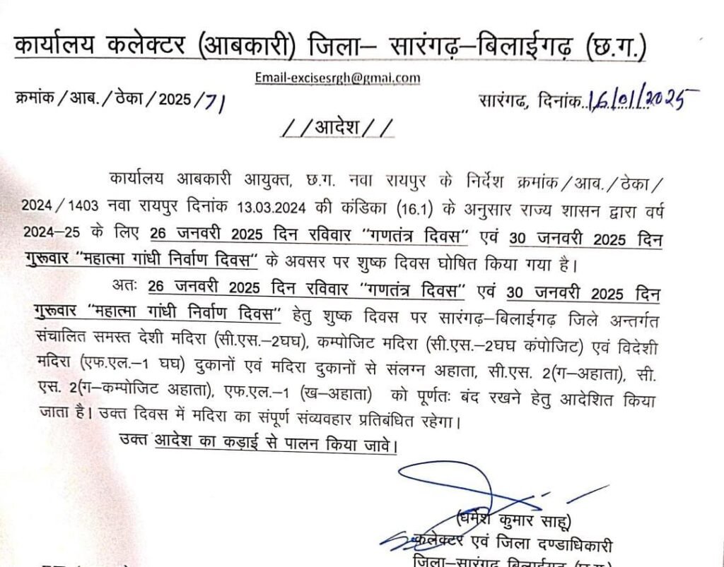 सारंगढ़ बिलाईगढ़, 29 जनवरी 2025/ कलेक्टर एवं जिला दण्डाधिकारी धर्मेश कुमार साहू ने 30 जनवरी गुरुवार को महात्मा गांधी निर्वाण दिवस के अवसर पर जिले को को शुष्क दिवस घोषित का आदेश जारी किया है। इस आदेश के पालन में सारंगढ़ बिलाईगढ़ जिले की सीमा में संचालित समस्त देशी मदिरा दुकान (सीएस-2 घघ), कंपोजिट मदिरा (सीएस-2 घघ कंपोजिट), विदेशी मदिरा दुकान (एफ.एल-1 घघ) दुकानों एवम मदिरा दुकानों से संलग्न अहाता, सीएस 2 (ग- अहाता), सीएस 2 (ग- कंपोजिट अहाता), एफ एल 1 (ख- अहाता) को पूर्णतः बंद रहेगा। इस दौरान मदिरा का संपूर्ण संव्यवहार प्रतिबंधित रहेगा।