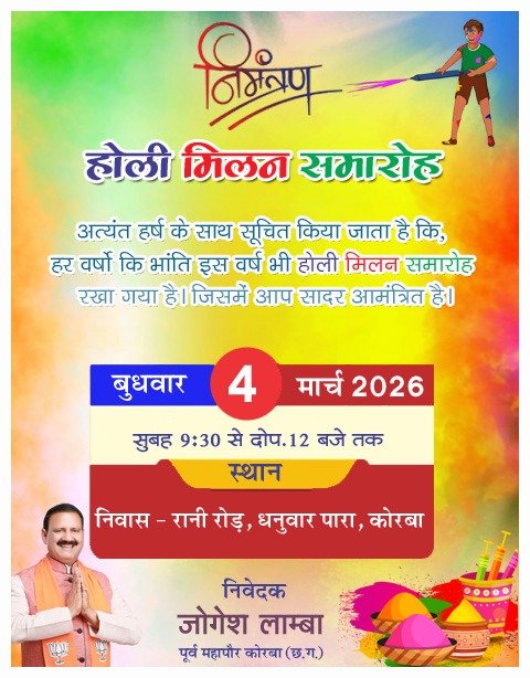 कोरबा में 4 मार्च को रंगों की बौछार: पूर्व महापौर जोगेश लाम्बा के सान्निध्य में भव्य होली मिलन समारोह 🎉