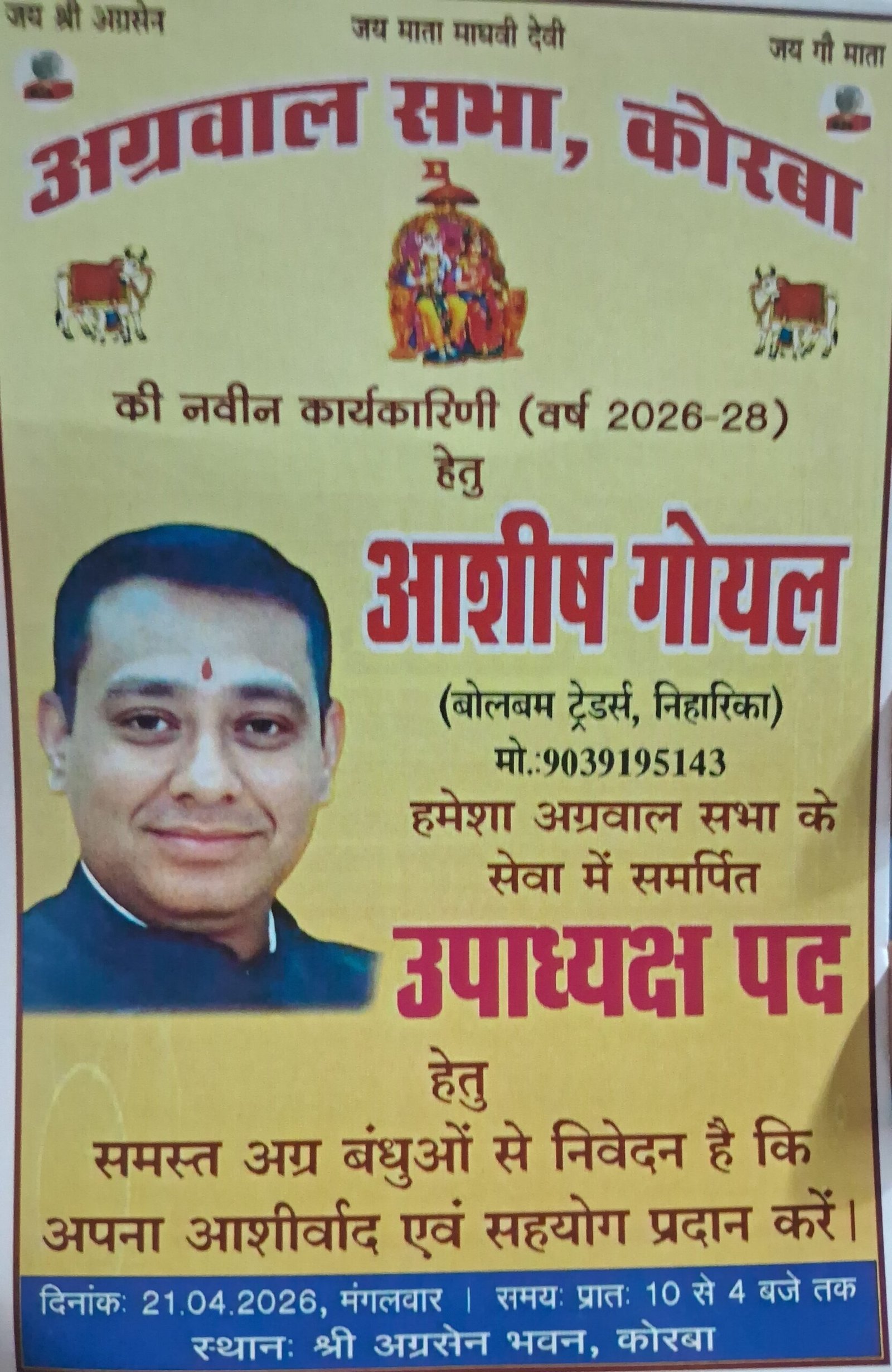 उन्होंने समस्त अग्र बंधुओं से निवेदन किया है कि उन्हें उपाध्यक्ष पद हेतु समर्थन प्रदान करें, ताकि वे समाज के विकास और एकता के लिए बेहतर कार्य कर सकें।