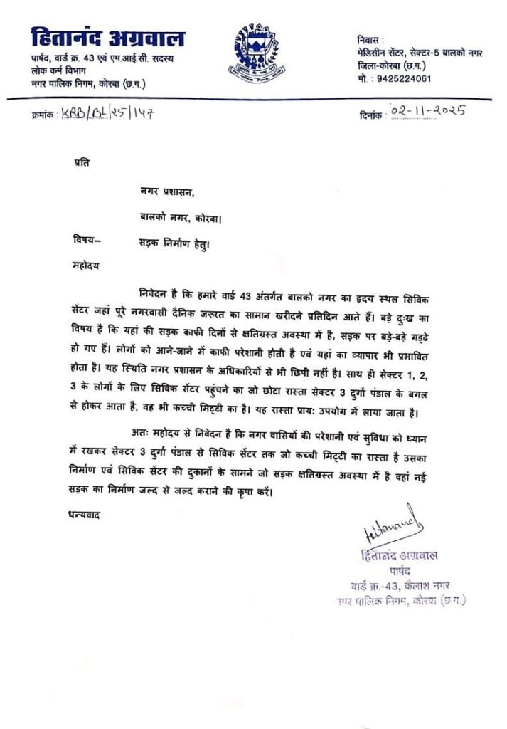 जहां प्रतिदिन सैकड़ो लोग खरीददारी के लिए आते हैं। वहां की सड़कों का हाल बेहाल है, लोगों को आने-जाने में परेशानी होती है। उक्त सिविक सेंटर व्यापारिक क्षेत्र पूर्व नेता प्रतिपक्ष एवं MIC सदस्य हितानंद अग्रवाल के वार्ड क्षेत्र में आता है। लोगों की परेशानियों को देखते हुए हितानंद अग्रवाल ने बालको प्रबंधन को पत्र लिखा। जिसमें उन्होंने लिखा कि वार्ड 43 अंतर्गत बालको नगर का हृदय स्थल सिविक सेंटर जहां पूरे नगरवासी दैनिक जरूरत का सामान खरीदने प्रतिदिन आते हैं।