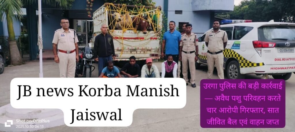 पुलिस अधीक्षक श्री सिद्धार्थ तिवारी के निर्देशन, अतिरिक्त पुलिस अधीक्षक नीतिश ठाकुर एवं एसडीओपी भूषण एक्का के मार्गदर्शन में उरगा थाना पुलिस ने अवैध पशु परिवहन के मामले में बड़ी सफलता हासिल की है। पुलिस ने चार आरोपियों को गिरफ्तार करते हुए सात जीवित बैलों को बूचड़खाने ले जाए जाने से बचा लिया है।