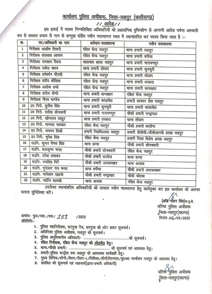 Big breaking jashpur चुनाव खत्म होते ही पुलिस विभाग में बड़ी सर्जरी, बदल दिए गए गए थानेदार और चौकी के प्रभारी, देखिये पूरी सूची