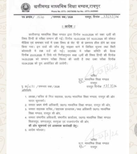 रायपुर | छत्तीसगढ़ माध्यमिक शिक्षा मण्डल (माशिमं) से इस वक्त की सबसे बड़ी खबर सामने आ रही है। राजधानी रायपुर से जारी एक आधिकारिक आदेश के अनुसार, कक्षा 12वीं की हिंदी विषय की परीक्षा को निरस्त कर दिया गया है। पेपर लीक होने के दावों और साइबर थाने में दर्ज FIR के बाद बोर्ड ने यह कड़ा कदम उठाया है।