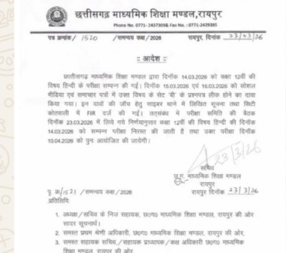 रायपुर | छत्तीसगढ़ माध्यमिक शिक्षा मण्डल (माशिमं) से इस वक्त की सबसे बड़ी खबर सामने आ रही है। राजधानी रायपुर से जारी एक आधिकारिक आदेश के अनुसार, कक्षा 12वीं की हिंदी विषय की परीक्षा को निरस्त कर दिया गया है। पेपर लीक होने के दावों और साइबर थाने में दर्ज FIR के बाद बोर्ड ने यह कड़ा कदम उठाया है।