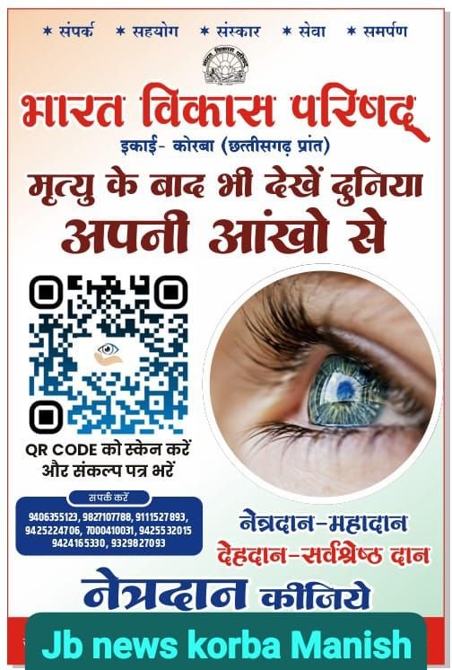 कोरबा। भारत विकास परिषद् इकाई-कोरबा (छत्तीसगढ़ प्रांत) द्वारा नेत्रदान के प्रति जनजागरूकता अभियान चलाया जा रहा है। परिषद ने “मृत्यु के बाद भी देखें दुनिया अपनी आंखों से” जैसे प्रेरणादायी संदेश के साथ लोगों से नेत्रदान करने की अपील की है।