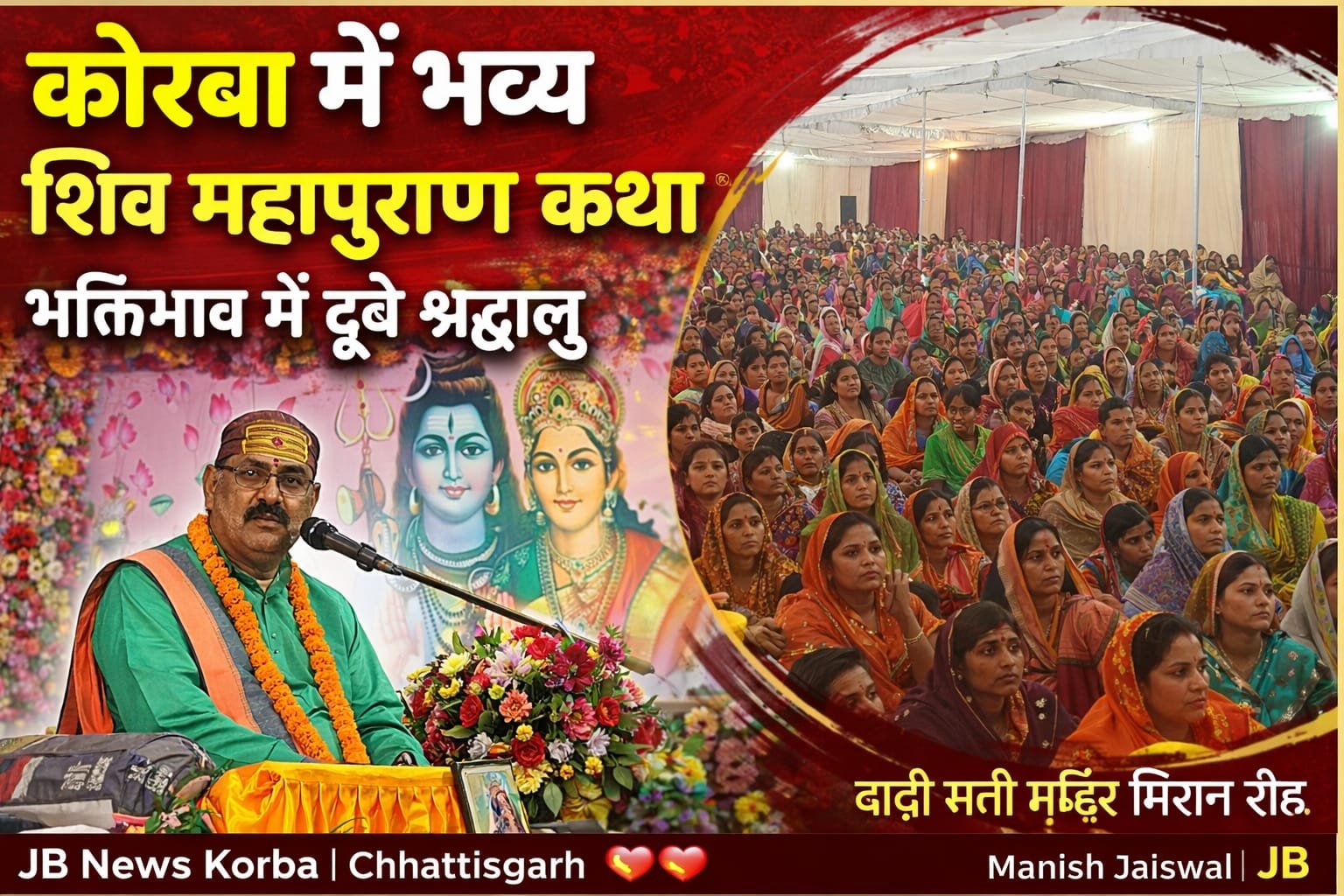 कोरबा शहर के मिशन रोड स्थित रानी सती दादी मंदिर के सामने इन दिनों भव्य शिव महापुराण कथा का आयोजन बड़े ही श्रद्धा और उत्साह के साथ किया जा रहा है। इस धार्मिक आयोजन में प्रतिदिन बड़ी संख्या में श्रद्धालु पहुंचकर कथा श्रवण कर रहे हैं और भगवान शिव की भक्ति में लीन नजर आ रहे हैं।