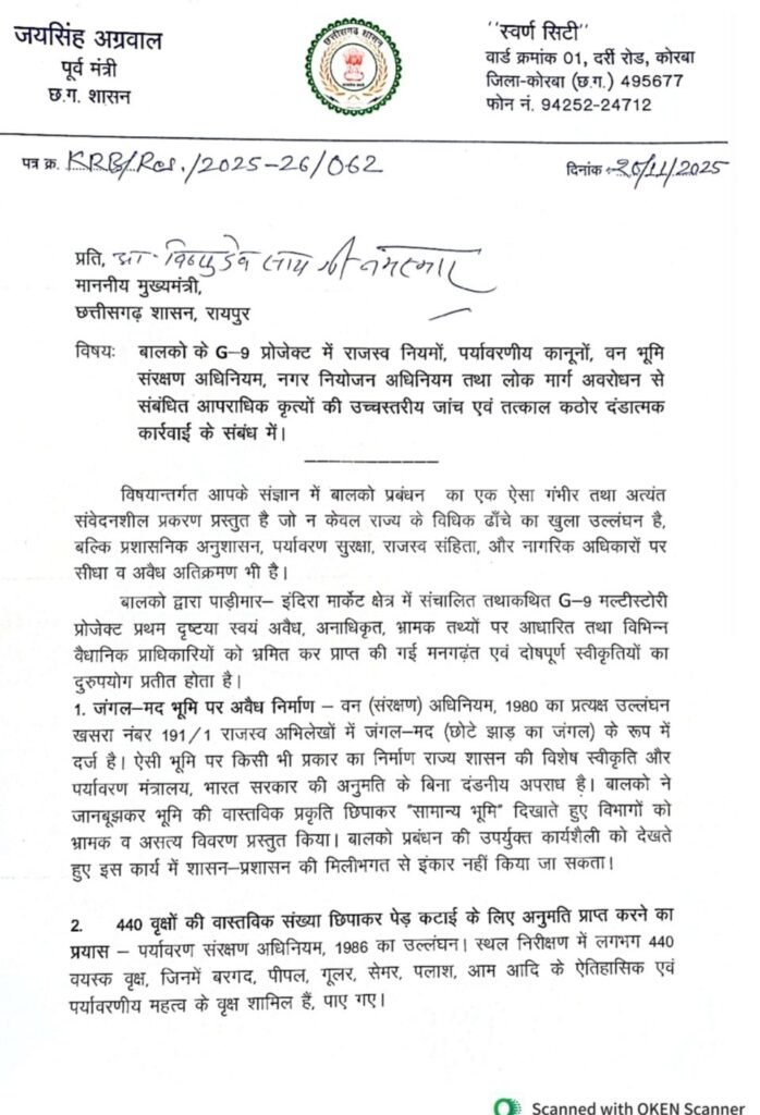 कोरबा 20 नवंबर 2025। कोरबा में बालको के निर्माणाधीन जी-9 मंजिला आधुनिक भवन निर्माण पर राजनीति गरमा गयी है। तीन दिन पहले ही इस निर्माण कार्य का श्रम एवं उद्योग मंत्री लखनलाल देवांगन ने भूमिपूजन किया था। वहीं अब पूर्व मंत्री जयसिंह अग्रवाल ने बालको के इस निर्माण पर गंभीर आरोप लगाते हुए मुख्यमंत्री से शिकायत कर जांच की मांग की है। जयसिंह अग्रवाल ने बालको प्रबंधन पर राजस्व नियमों, पर्यावरणीय कानूनों, वन संरक्षण अधिनियम समेत सभी वैधानिक नियम और कानून की धज्जियां उड़ाने का गंभीर आरोप लगाया है।