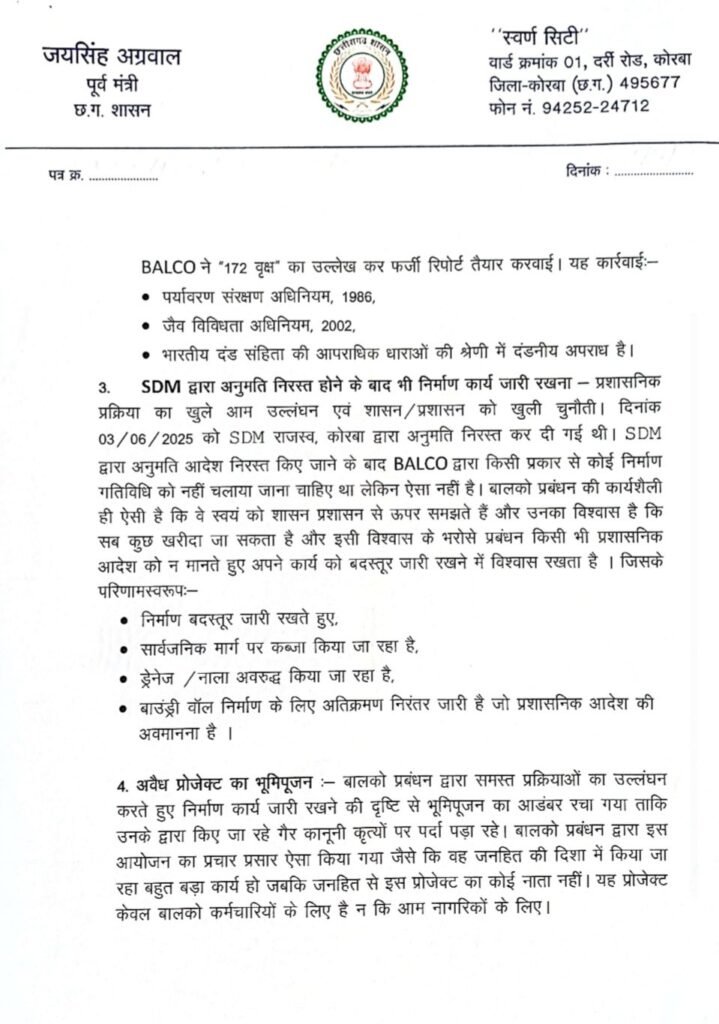 पूर्व मंत्री जयसिंह अग्रवाल ने मुख्यमंत्री से तत्काल G-9 परियोजना के सभी निर्माण कार्यों पर रोक लगाने, भूमि, पर्यावरण व स्वीकृतियों की उच्चस्तरीय विशेष जांच,फर्जी दस्तावेजों व आदेश उल्लंघन पर BALCO प्रबंधन के विरुद्ध आपराधिक प्रकरण दर्ज करने व सार्वजनिक मार्ग को तुरंत खोलने, ड्रेनेज व भूमि को मूल स्थिति में पुनर्स्थापित करने तथा संलिप्त अधिकारियों पर कठोर कार्रवाई जैसे निर्णय लेने की मांग की है। जयसिंह अग्रवाल ने कहा कि….“यह केवल अवैध निर्माण का मामला नहीं, बल्कि कानून, पर्यावरण और नागरिक अधिकारों पर संगठित हमला है।” अग्रवाल ने कहा कि बालको प्रबंधन की इन कार्रवाइयों से यह सिद्ध होता है कि वे स्वयं को कानून से ऊपर मानते हैं।