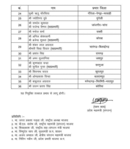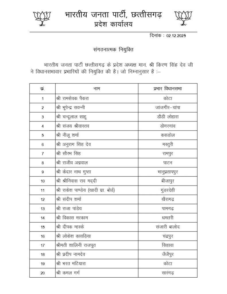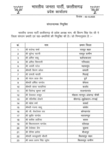 रायपुर, 02 दिसम्बर । भारतीय जनता पार्टी के प्रदेश अध्यक्ष किरण सिंह देव ने विधानसभावार प्रभारियों के साथ जिला संगठन प्रभारी और सह-प्रभारियों की नियुक्ति की है. एक तरफ जहां 36 विधानसभा प्रभारियों के साथ 36 जिला संगठन प्रभारियों की नियुक्ति की गई है.