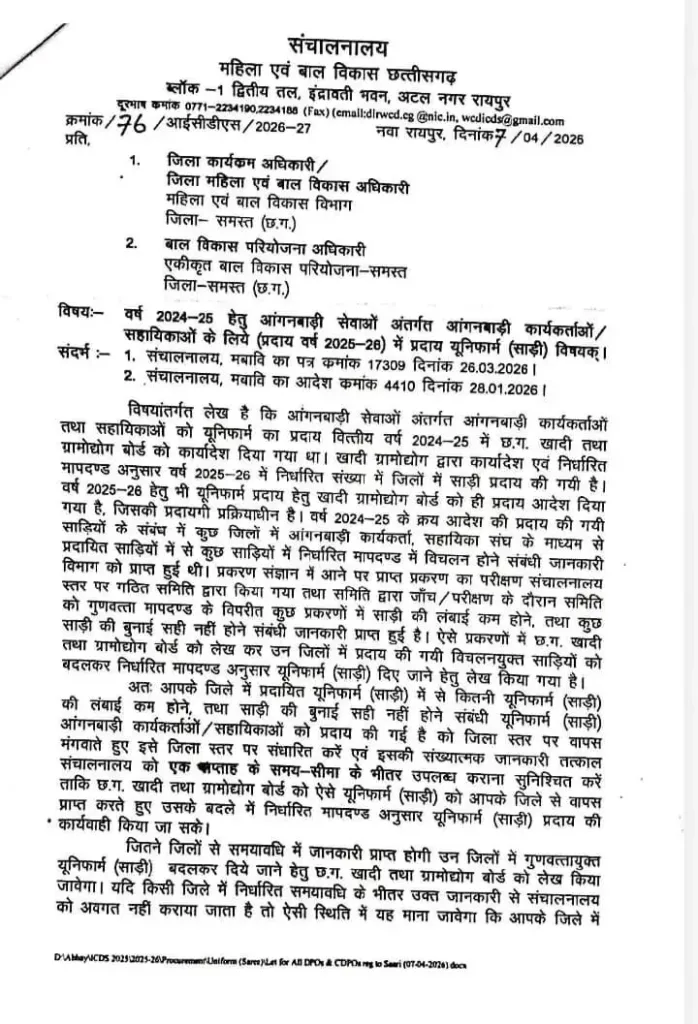बीजेपी के सुशासन के दौर में अगस्त 2025 से फरवरी 2026 तक आंगनबाड़ी स्तर पर घटिया साड़ी का वितरण किया गया था।उधर, साडी खरीदी में भ्रष्टाचार और विवादों के सामने आने के बाद प्रदेश के विभिन्न जिलों से साड़ी की खेप की वापिसी पर ज़ोर दिया जा रहा है| बिलासपुर समेत कई जिलों के विभागीय संचालको ने इसके लिए हाथ-पांव मारना शुरू कर दिया है| विभागीय अधिकारी दावा कर रहे है,कि घटिया साड़ियों को बदलकर नई साड़ी दोबारा प्रदान की जाएगी|