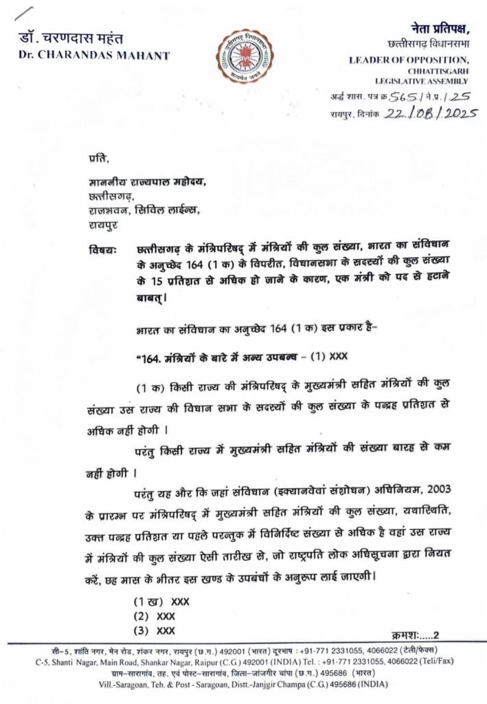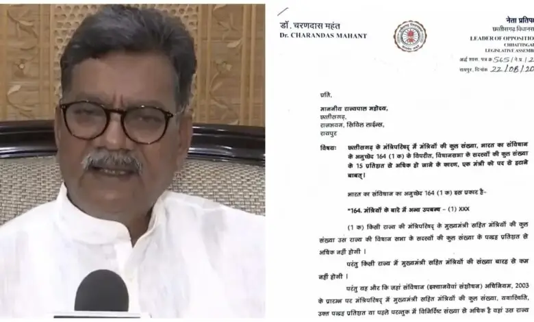 रायपुर, 22 अगस्त। Letter to the Governor : छत्तीसगढ़ की राजनीति में एक बार फिर गरमाहट आ गई है। नेता प्रतिपक्ष डॉ. चरण दास महंत ने राज्यपाल रमेन डेका को पत्र लिखकर हाल ही में साय सरकार द्वारा किए गए मंत्रिमंडल विस्तार को लेकर गंभीर आपत्ति जताई है। उन्होंने संवैधानिक नियमों का हवाला देते हुए, एक मंत्री को तत्काल पद से हटाने की मांग की है।