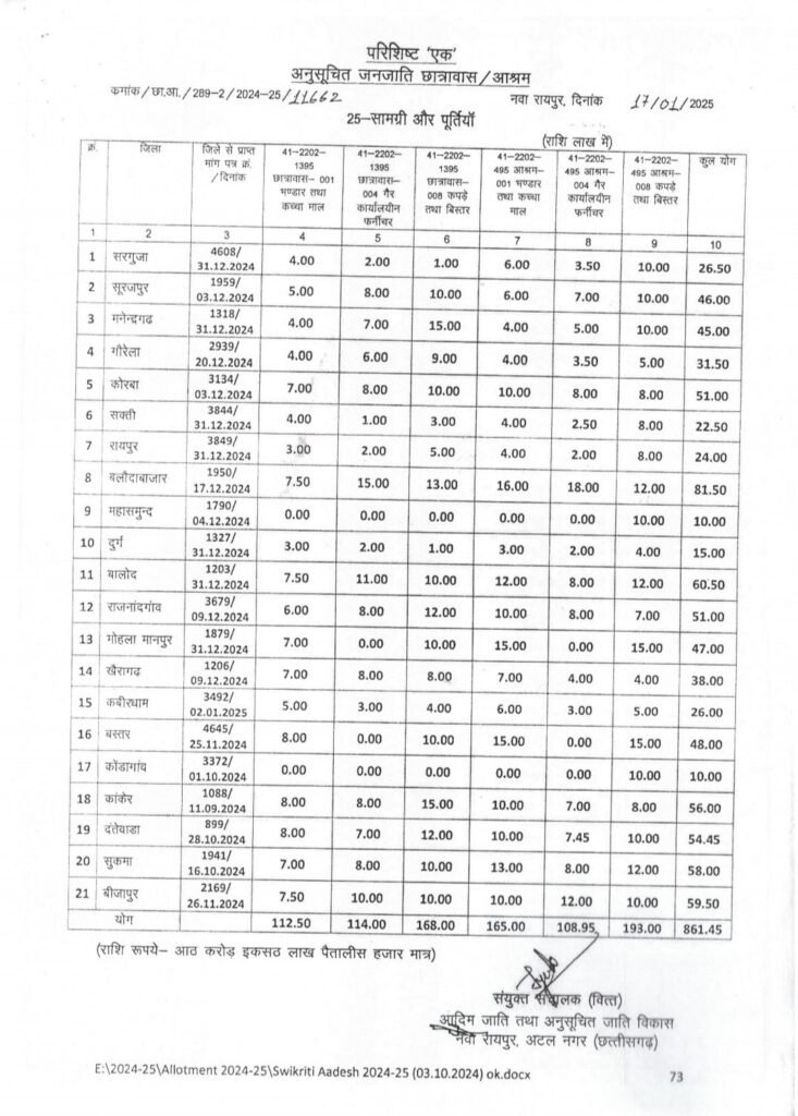 छात्रावास -भण्डार तथा कच्चा माल ,छात्रावास ;गैर कार्यालयीन फर्नीचर ,छात्रावास -कपड़े तथा बिस्तर,आश्रम- भण्डार तथा कच्चा माल ,छात्रावास गैर कार्यालयीन फर्नीचर ,आश्रम -कपड़े तथा बिस्तर के लिए उपरोक्त राशि आबंटित की गई थी।