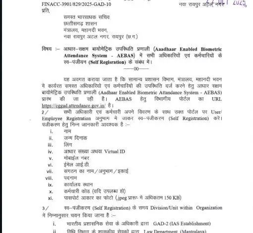 CG News: मंत्रालय महानदी भवन में 1 दिसंबर से लागू होगा आधार आधारित बायोमैट्रिक अटेंडेंस सिस्टम, 7 नवंबर तक करना होगा AEBAS पोर्टल पर पंजीकरण, देखें आदेश