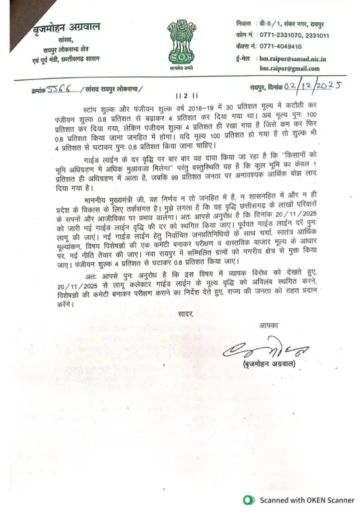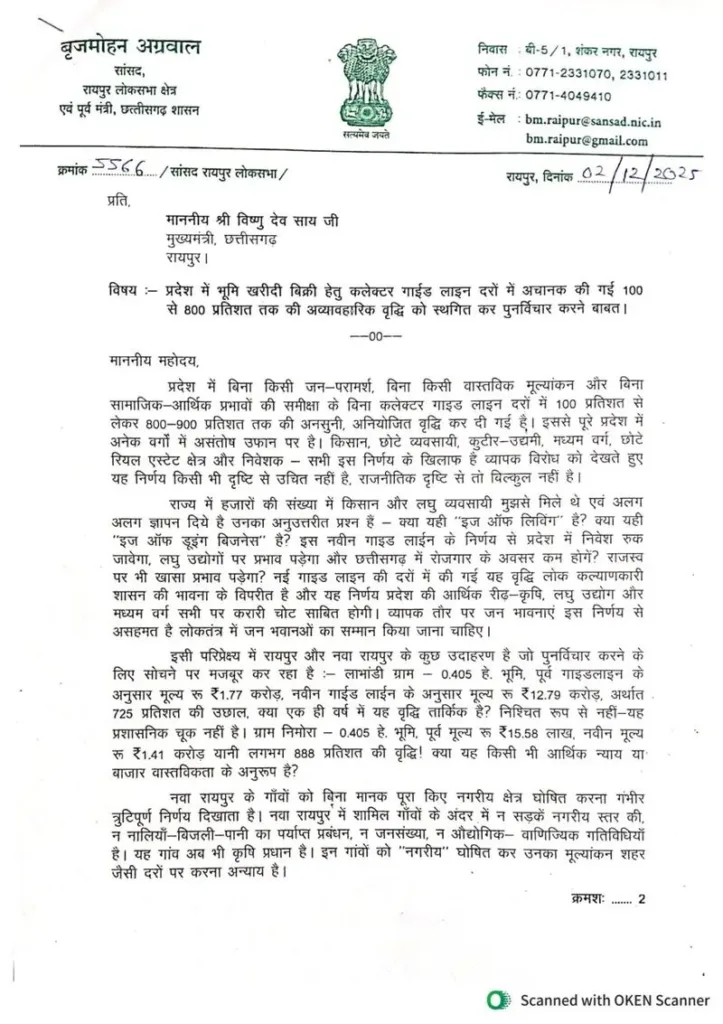CG News : कलेक्टर गाइडलाइन की अव्यावहारिक वृद्धि पर सांसद बृजमोहन का प्रहार, मुख्यमंत्री को पत्र लिखकर तत्काल स्थगन की मांग