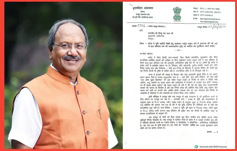 रायपुर। छत्तीसगढ़ की जनता के हितों की रक्षा के लिए सदैव तत्पर रहने वाले वरिष्ठ भाजपा नेता एवं रायपुर लोकसभा सांसद श्री बृजमोहन अग्रवाल ने एक बार फिर अपनी दृढ़, संवेदनशील और जननायक शैली का परिचय दिया है। प्रदेश में भूमि खरीदी-बिक्री के लिए कलेक्टर गाइडलाइन दरों में 100 से 800 प्रतिशत तक की वृद्धि पर आपत्ति जताते हुए, मुख्यमंत्री श्री विष्णुदेव साय को विस्तृत पत्र लिखकर इस निर्णय को तत्काल स्थगित कर पुनर्विचार करने की मांग की है।