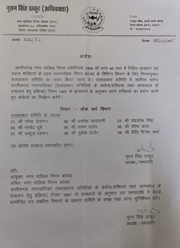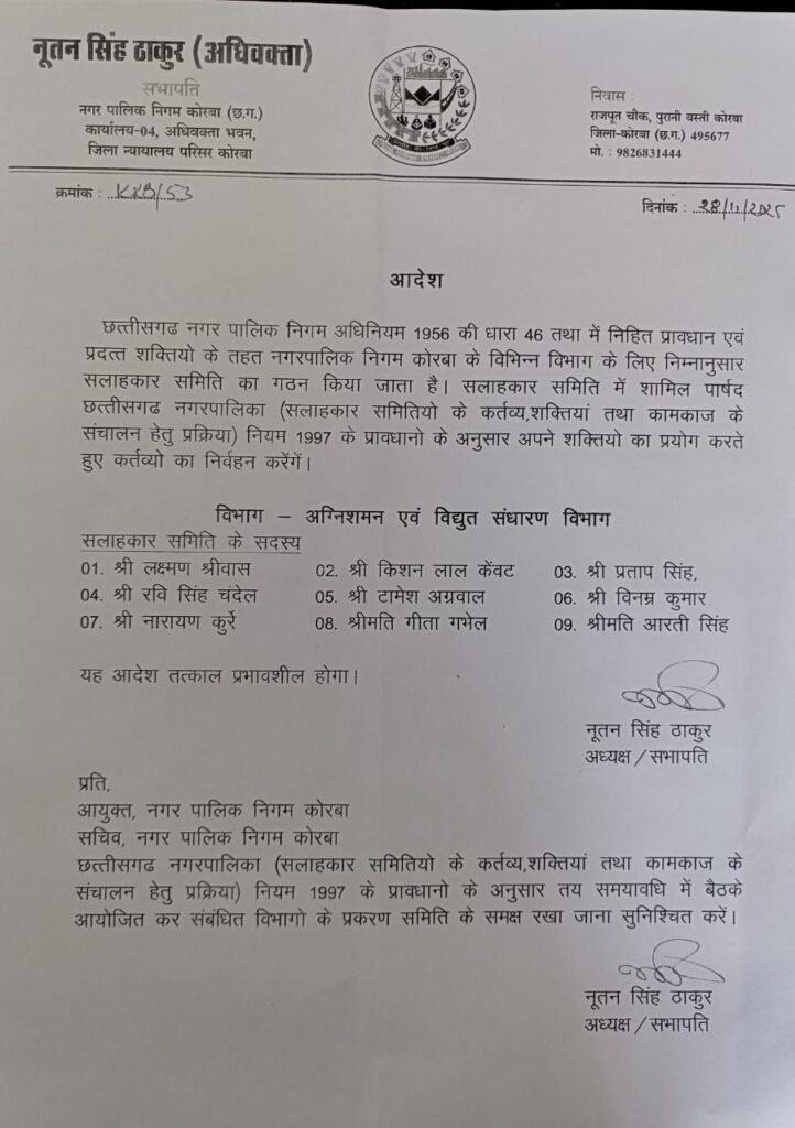 कोरबा, 28 नवंबर 2025: कोरबा नगर पालिक निगम के सभापति नूतन सिंह ठाकुर ने छत्तीसगढ़ नगर पालिक निगम अधिनियम 1956 की धारा 46 के तहत मिली शक्तियों का प्रयोग करते हुए दो महत्वपूर्ण विभागों के लिए सलाहकार समितियों का गठन किया है। यह आदेश तत्काल प्रभाव से लागू कर दिया गया है।