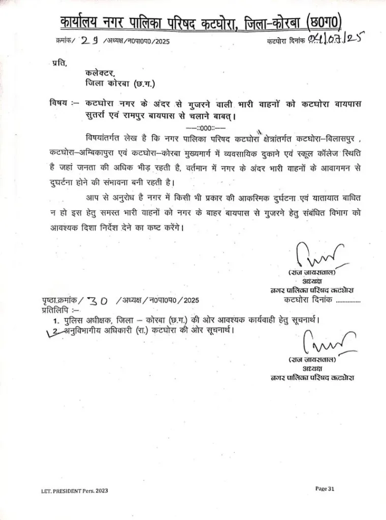 कोरबा/कटघोरा, 4 जुलाई 2025 कटघोरा नगर में बढ़ते यातायात दबाव और संभावित दुर्घटनाओं को लेकर नगर पालिका परिषद अध्यक्ष श्री राज जायसवाल ने चिंता व्यक्त की है। उन्होंने इस विषय में जिला कलेक्टर और जिला पुलिस अधीक्षक को पत्र लिखकर समस्या से अवगत कराया है और समाधान हेतु ठोस कदम उठाने का आग्रह किया है।