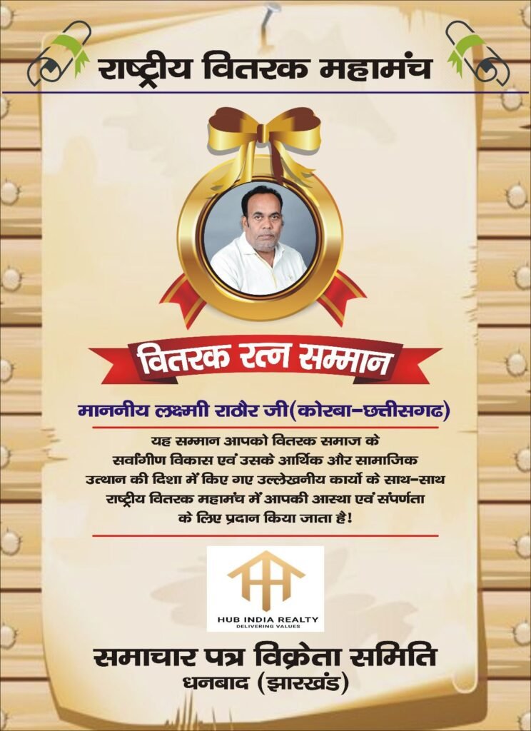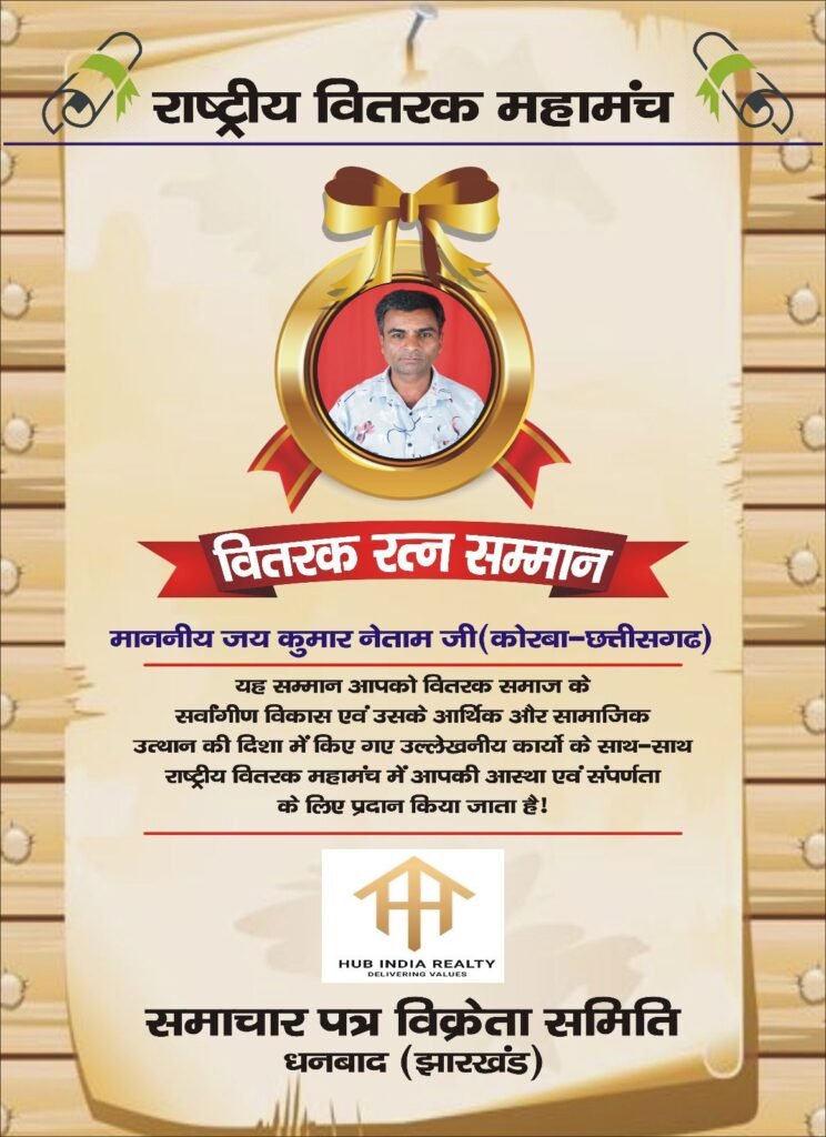 कोरबा। कुछ दिन पूर्व धनबाद में राष्ट्रीय अखबार वितरक महामंच का राष्ट्रीय सम्मेलन आयोजित हुआ था, जिसमें छत्तीसगढ़ अखबार वितरक संघ की कोरबा जिला इकाई के संरक्षक पद्मसिंह चंदेल, कोरबा जिला अध्यक्ष विपेन्द्र कुमार साहू, कोषाध्यक्ष लक्ष्मी राठौर एवं सचिव जय कुमार नेताम को अखबार वितरक रत्न सम्मान से सम्मानित किया गया, महासम्मेलन के बाद राष्ट्रीय अखबार वितरक मंच ने अपनी कार्यकारिणी का विस्तार किया जिसमें पद्मसिंह चंदेल को राष्ट्रीय वितरक महामंच द्वारा छत्तीसगढ़ प्रदेश के चेयरमेन नियुक्त किया गया है, वहीं जिलाध्यक्ष विपेन्द्र कुमार साहू को छत्तीसगढ़ प्रदेश प्रभारी (शहरी) का दायित्व दिया गया है। उक्ताशय का नियुक्ति पत्र राष्ट्रीय अध्यक्ष रामरक्षा सिंह ने जारी किया गया है। इसके अलावा अन्य प्रदेश प्रभारियों की भी घोषणा की गई है।