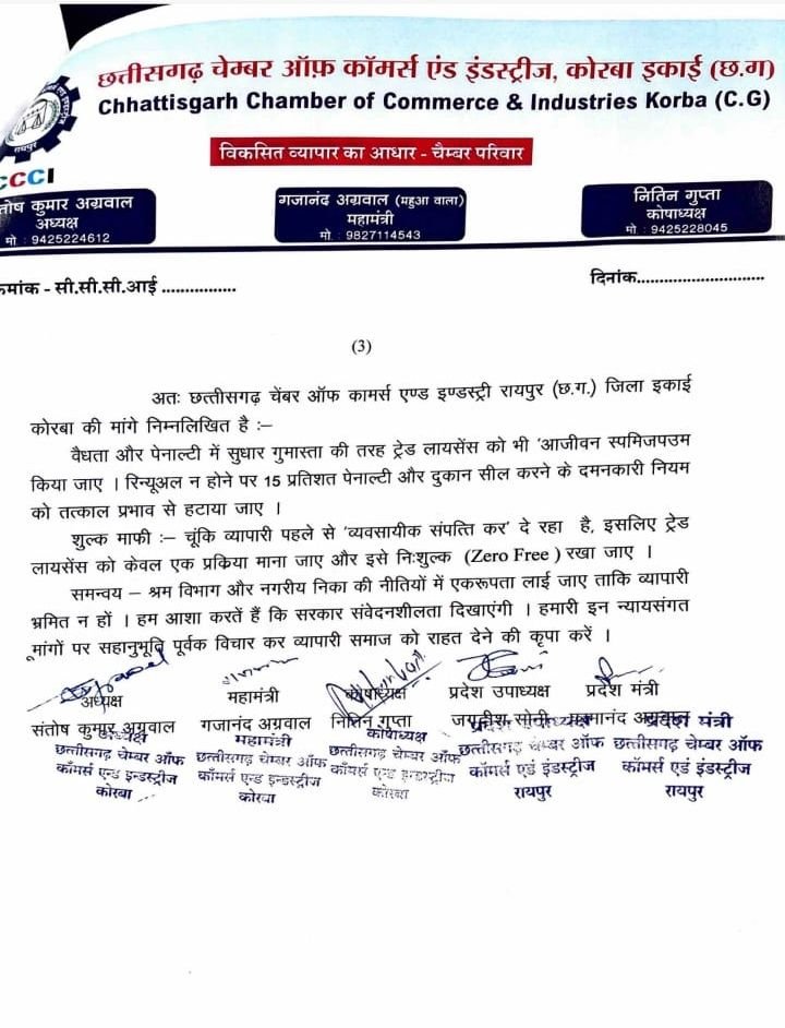 ज्ञापन सौंपने के दौरान छत्तीसगढ़ चेम्बर ऑफ कॉमर्स के अध्यक्ष संतोष अग्रवाल, प्रदेश उपाध्यक्ष जगदीश सोनी, प्रदेश मंत्री परमानंद अग्रवाल, महामंत्री गजानंद अग्रवाल, कार्यकारी अध्यक्ष पारस राम रमानी, कोषाध्यक्ष नितिन गुप्ता, उपाध्यक्ष नीतीश डालमिया, प्रेम रामचंदानी सहित बड़ी संख्या में व्यापारीगण उपस्थित रहे।